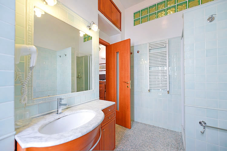 Il bagno, squisitamente caratterizzato da un mosaico verde acqua, è provvisto di cabina doccia, bidet e asciugacapelli.